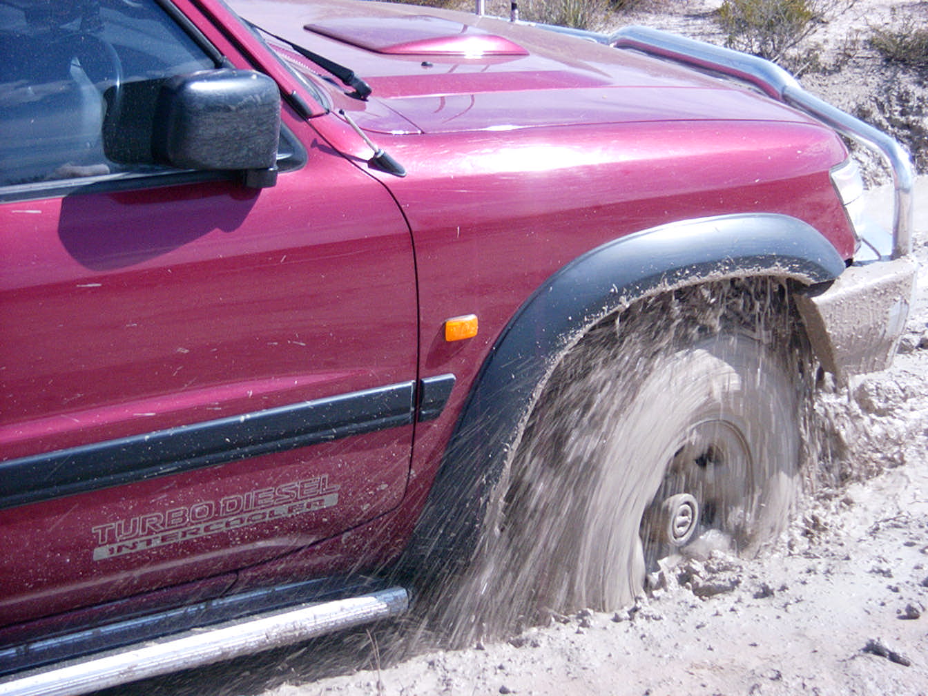 After this we headed down to the river to wash the cars off a a bit. I managed to soak my air filter which promplt destroyed itself and I hit a large submerged log, denting a rim severely (I could feel it hitting on the steering knuckle), necessitating a wheel change on the sand in the middle of the river.