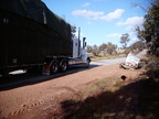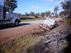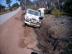 Nearing the end of the day, we found the edge of the forest and a bitumen road. I went to do a U-turn and decided that the ditch on the side of the road was ok to turn through. Skip commented as I was going in "Gee - you're brave" and that was the end of that.